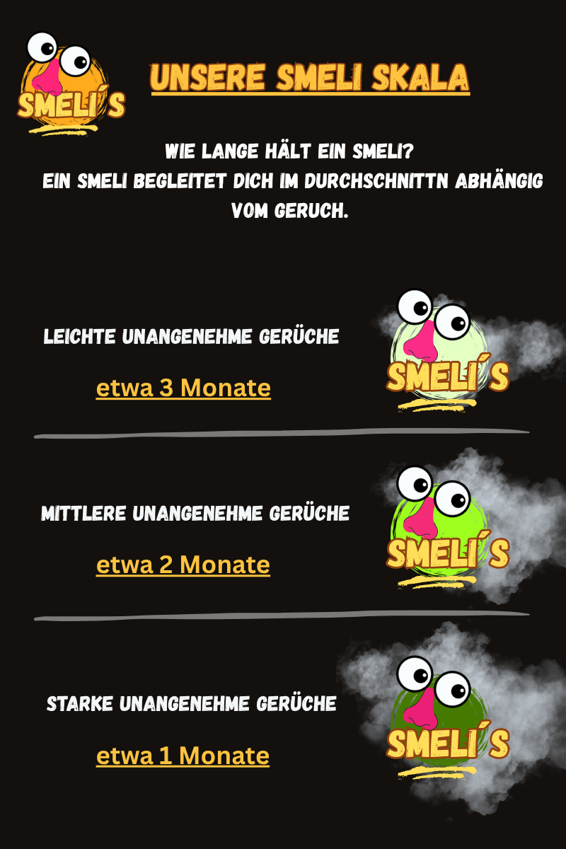 Sie zeigt dir auf einen Blick, wie intensiv der Geruch ist und wie lange dein Smeli wirkt, bevor er seine Neutralisationskraft verliert.